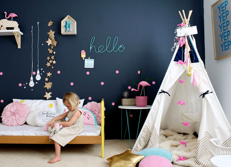 Една од најважните одлуки на самиот почеток на украсување детска соба е изборот на бои. Дозволете им на децата да помогнат во изборот на бои. Одличен начин да ги вклучите во процесот на дизајнирање и да ги заинтересирате за нивната нова просторија. Ако се сомневате во изборот на детето, определете 3 можни комбинации според вас и потоа оставете го детето да избере. Безбеден начин за почеток е да изберете неутрална основа – на пример, бела или сива – потоа додадете една или две бои по желба. Некои родители се одлучуваат за добро познатиот класичен избор на бои – розова палета за девојчиња и сина за момчиња. Но, еве неколку комбинации што не вклучуваат само розова и сина боја.