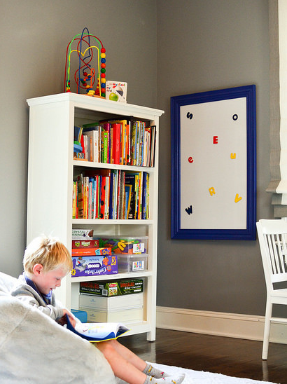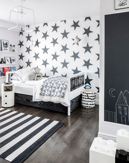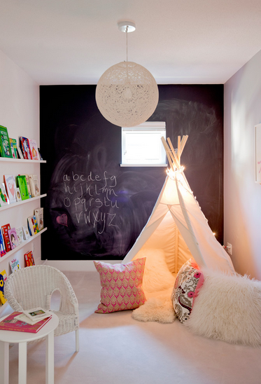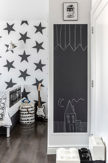 Убавината на уредувањето на детската соба е во тоа што можете и да играте и да се забавувате. Искористете ја предноста од вашата разиграна страна и пуштете ја креативноста. Има толку многу забавни проекти што можете да ги направите сами или со дете. Еден од нив е имитација на училишна табла низ целиот ѕид. Ѕидот ќе стане место каде децата ќе можат да ја изразат својата креативност и да ја развијат. Може да се користи за игра, учење или како потсетник за некои обврски. Дури и кога детето расте ѕидот може да биде одлична идеја.