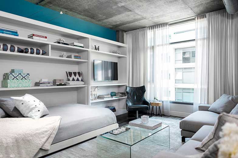 Кога сме ограничени во просторот, гледаме што најдобро одговара. Обидете се да ги искористите sидовите со поставување полици или ормари од врвот до дното за да поставите книги, слики и вашите омилени ситници во нив, и визуелно проширете го просторот попатно.