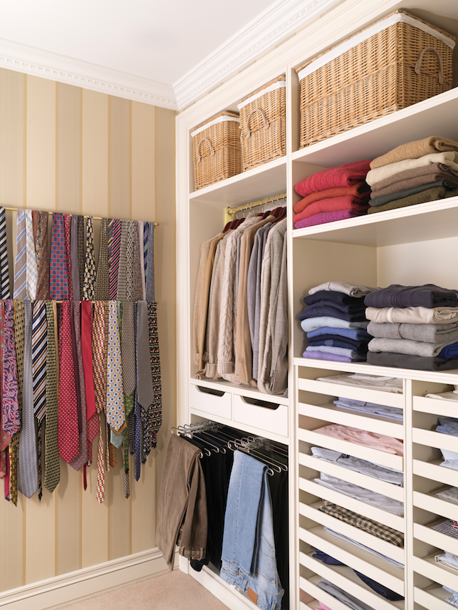 Држач за панталони. Секој држач за панталони 40x60x70 cm може да собере 11 панталони, 22 ако има по два пара на секоја закачалка. Тие се поделени по намена: за формални и неформални прилики. Одлична идеја за вратоврски: Искористен е ѕид со две решетки, на кој може да се обесат голем број вратоврски. Решението е одлично бидејќи сите вратоврски се видливи, а не зафаќаат простор во плакарот.