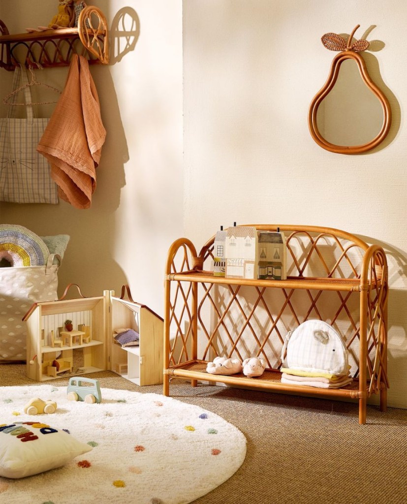 Плетен мебел ќе изгледа добро и во детските соби, затоа слободно украсете ги собите на вашите малечки со неколку плетени додатоци како ѕидна полица или плетена торба за играчки.