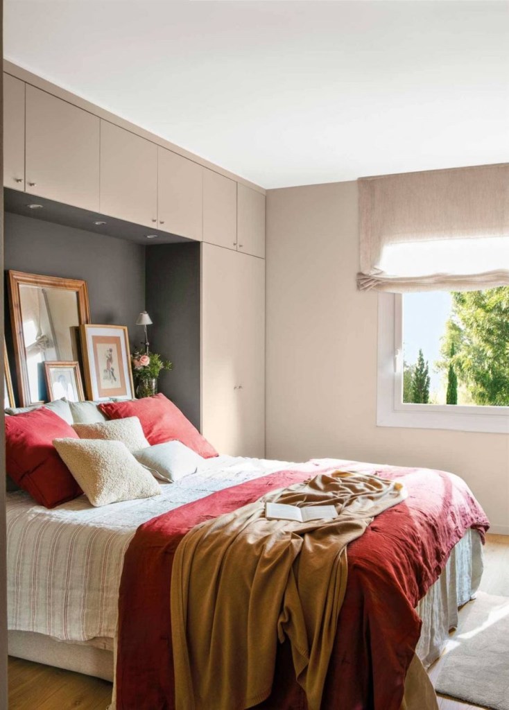 Искористете го максимумот од вашата спална соба, без разлика колку е мала на најдобар можен начин – со слободен простор над креветот. Направете мост со кабинети или отворени полици каде ќе ставате облека и работи кои не се од тековната сезона или кои поретко ги користите. Поврзете го мостот со кабинетите на страните на креветот.