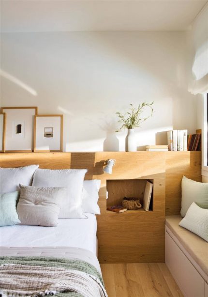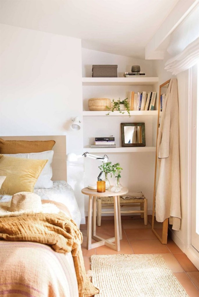 Користете вдлабнатини во просторијата за отворени полици на кои ќе ставате ситници – книги, кутии за накит или работи кои вообичаено ги ставате на ноќната масичка, доколку вдлабнатината е веднаш до креветот.