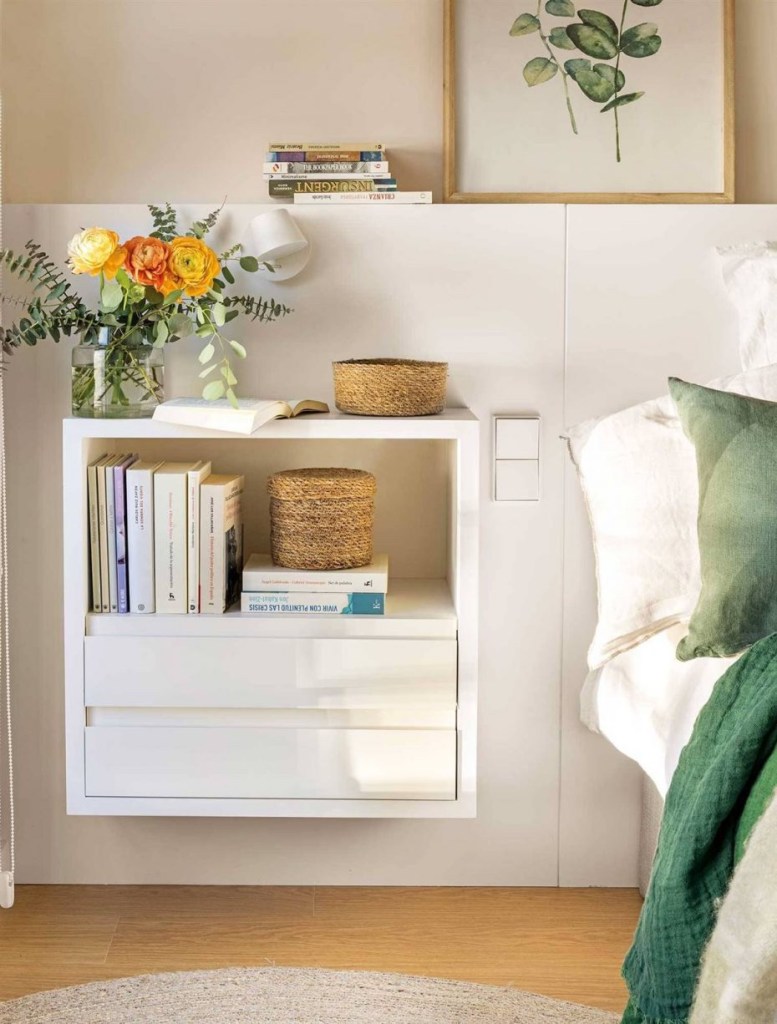 Ако немате простор за класична ноќна маса или поради нив не може да се отвори вратата од балконот или плакарот, размислете за ѕидните полици што ќе ги поставите над креветот или ќе ги поставите од страните на креветот, но не целосно до подот. Така, во пловечкото издание создаваат чувство на воздухопловност.