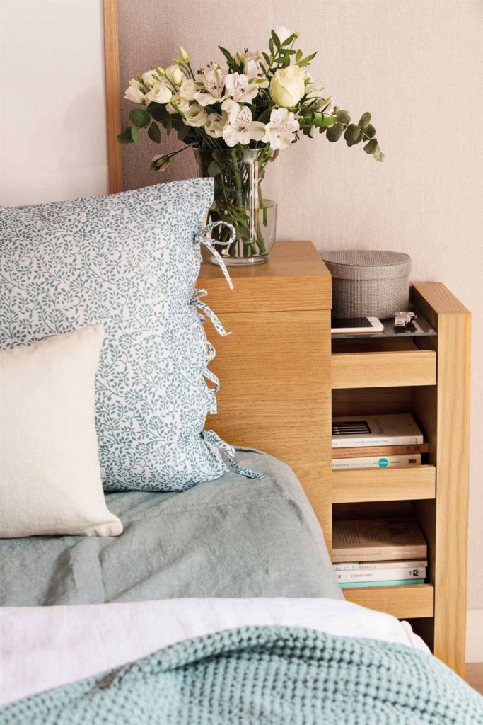 Заборавете на традиционалната ноќна маса и наместо тоа поставете лесни мобилни странични маси за да можете да ги отстраните и да дојдете до работите зад нив, во кабинетите што требаше да ги направите по мерка, за да ги искористите предностите на косините.