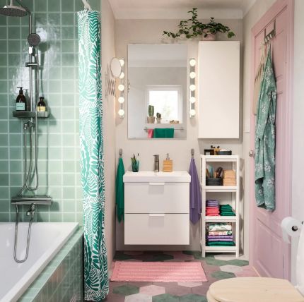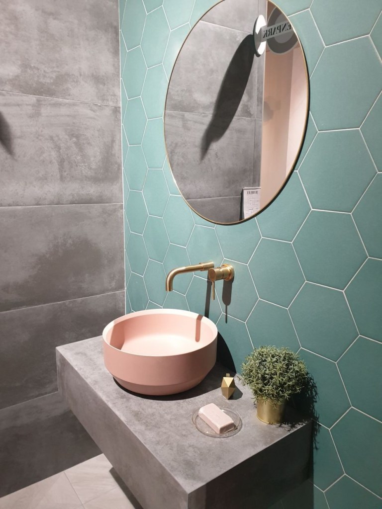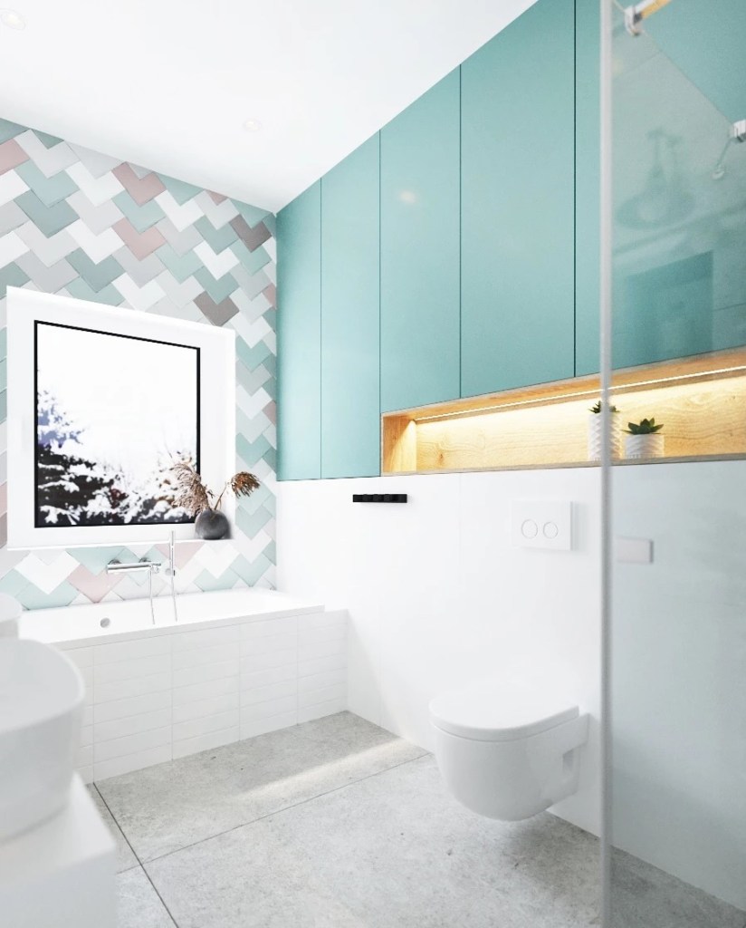 Трендовите во бањите донесоа сива боја, главно во дезен од бетон или мермер кој обично се комбинира со бела или црна боја. Но, нема да погрешите ако додадете пастелни тонови на жолта, сина, зелена, виолетова или розова. Особено ако не сте љубител на неутрални тонови на бели, сиви или црни или монохроматски простори и би сакале вашата бања да биде потопла и пожива или поромантична.