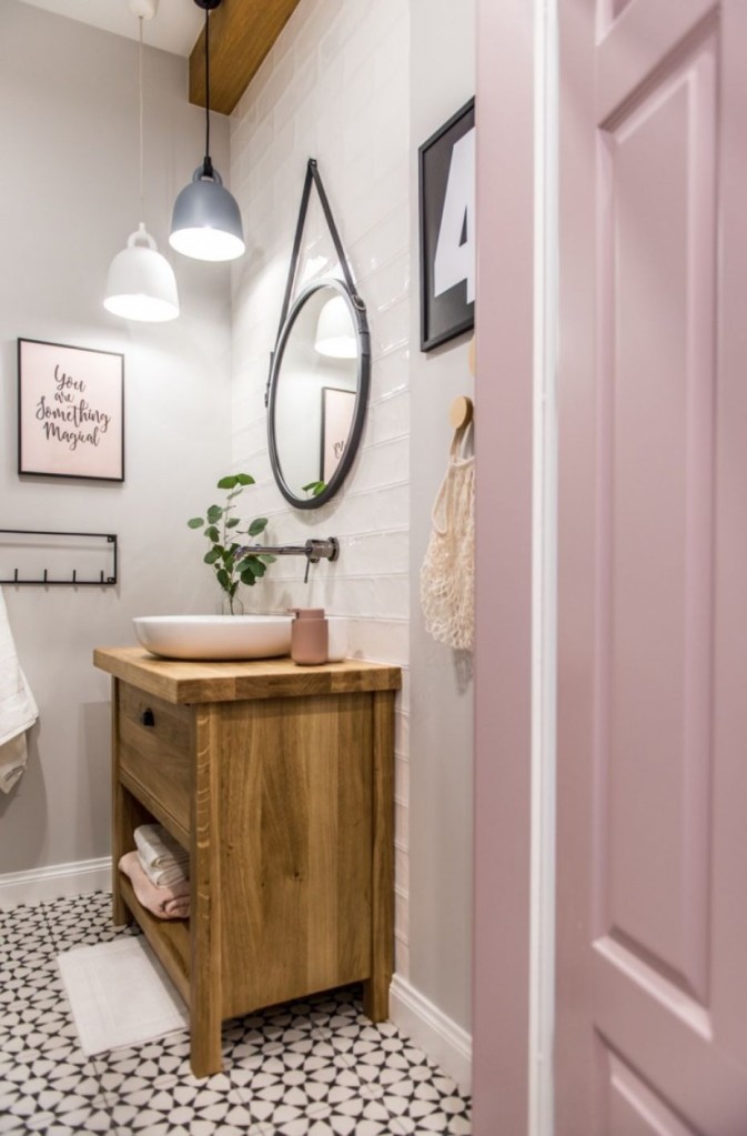 На неутрална позадина на сива, бела или црна, нанесете пастелни акценти кои ќе ја направат саканата промена во бањата. Без разлика дали станува збор за дел од ѕидот или подот во таа боја на керамика, санитарна опрема, кабинет, полици или додатоци за бања – чаша за четки, држач или дозер за сапун, кутија за ситници, корпа за отпадоци…