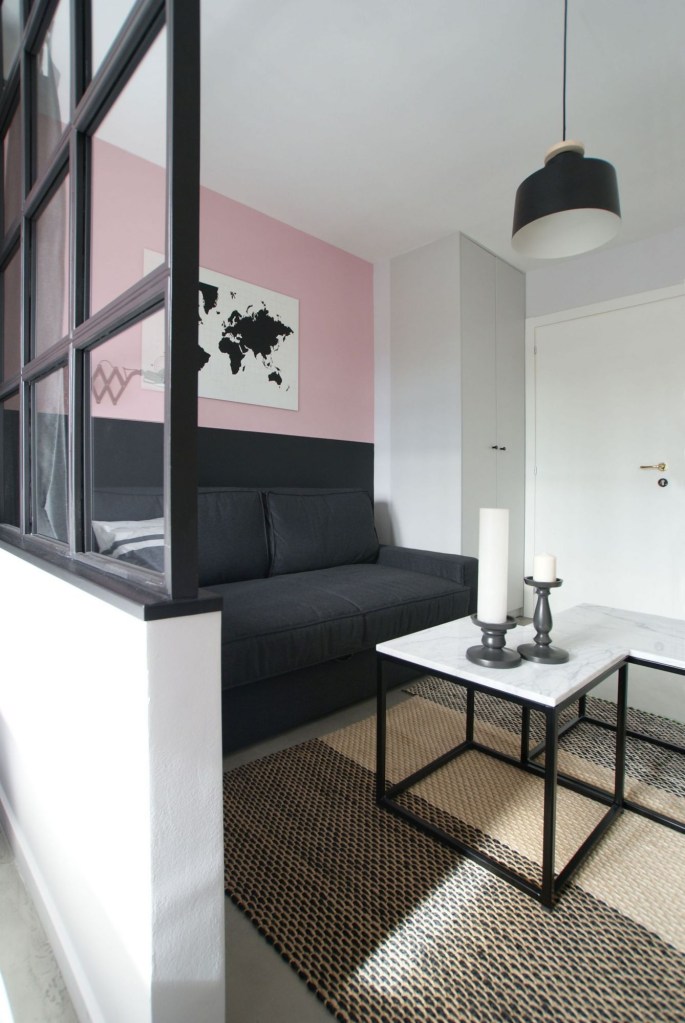 Апартманите со една спална соба се идеални за самци, но со текот на времето излегува дека посебен простор за спиење е многу неопходен. На примерот (фотографија доле) на овој мал стан можете да видите како е создадена мини спална соба со полуѕид од кнауф. На овој начин и кујната и трпезаријата добија приватност но и дополнителна декорација.