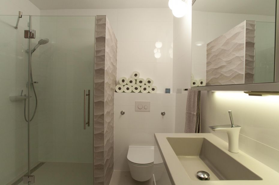 И уште една многу вообичаена практика во дизајнот на ентериер се преградните ѕидови во бањата. Дополнително поплочени, гипсените ѕидови ја одвојуваат туш кабината од останатата содржина.
