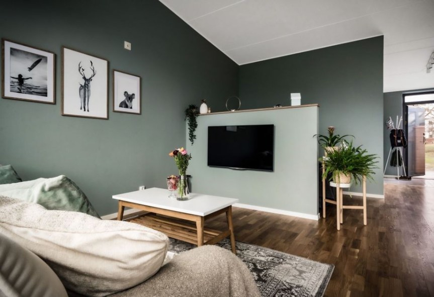 Со поставување на класични ѕидови дневната соба би изгледала многу помала. Неговата друга функција е ТВ ѕид, а за поголема привлечност, од едната страна е покриен со светло сини панели, а од другата е вграден аквариум. Така, преминот зад ѕидот, каде што се наоѓаат кабинетите, стана поатрактивен.
