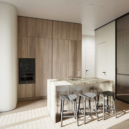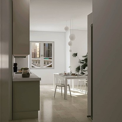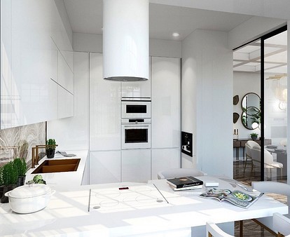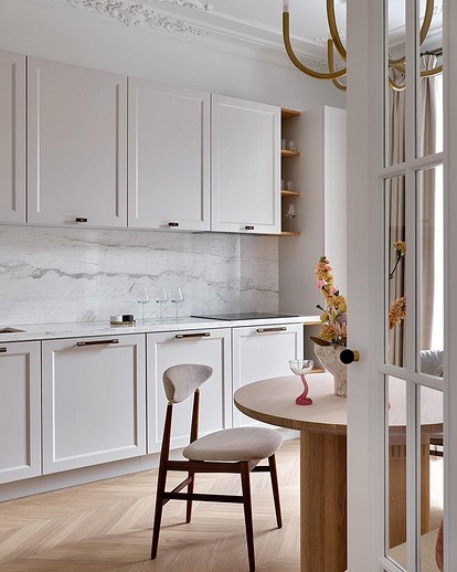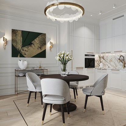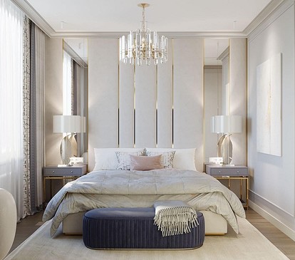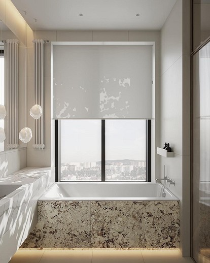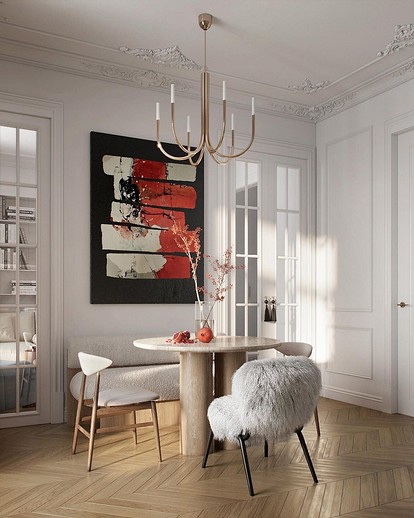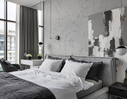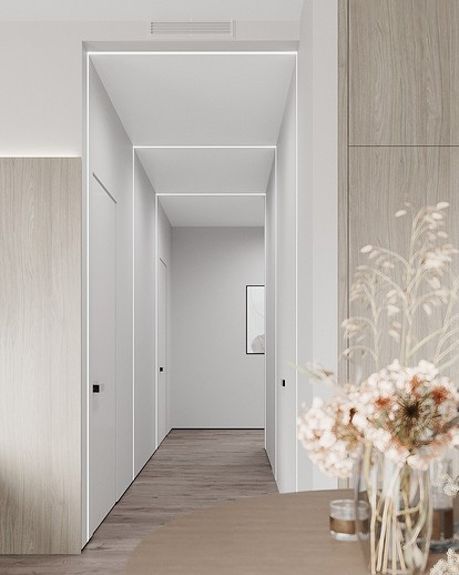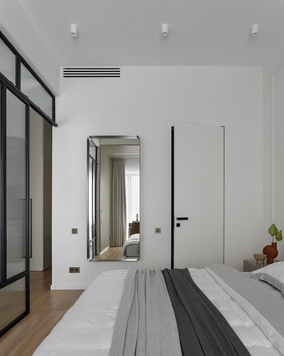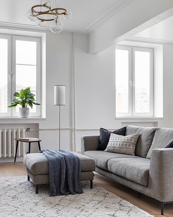 - Визуелно го зголемува просторот. Една од главните предности на ахроматот е можноста за визуелно проширување на просторот. Во комбинација со други слични тонови (како крем или бисерно сиво), отворени подови и површини со огледало, визуелно може да ја удвои вистинската големина на просторијата – што е многу важно за малите апартмани.