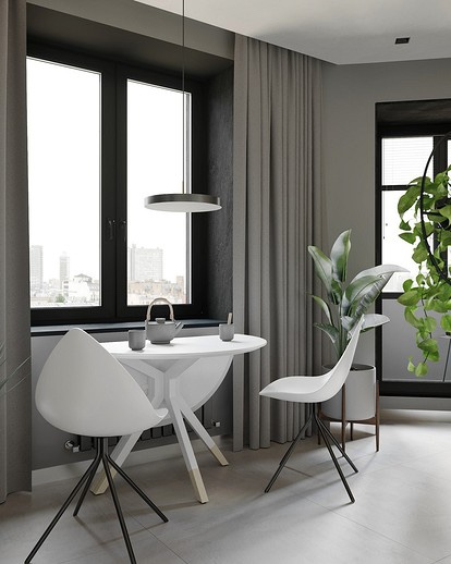 Всушност, ова не е толку едноставна комбинација. Се чини дека со оглед на тоа што сите три ахромати се универзални, нема ништо тешко да се комбинираат едни со други. Од една страна, да. Од друга страна, секоја од овие бои има одредени својства. На пример, светлите нијанси визуелно го прошируваат просторот, додека црната или темно сивата, напротив, го кријат. Во исто време, тие додаваат динамика и волумен. Затоа, важно е да се постигне вистинската рамнотежа во зависност од првичните податоци на просторијата и каков ефект сакате да постигнете. Колку е помала просторијата, толку повеќе треба да биде бела. Ако сакате пографичен ентериер, играјте на контрастот на црно-бело. Ако сакате поголема удобност и спокојство, користете различни варијации на сива боја, создавајќи мазни транзиции со нивна помош. Во принцип, комбинацијата на бели и сиви бои во внатрешноста изгледа многу елегантно и во исто време меко.