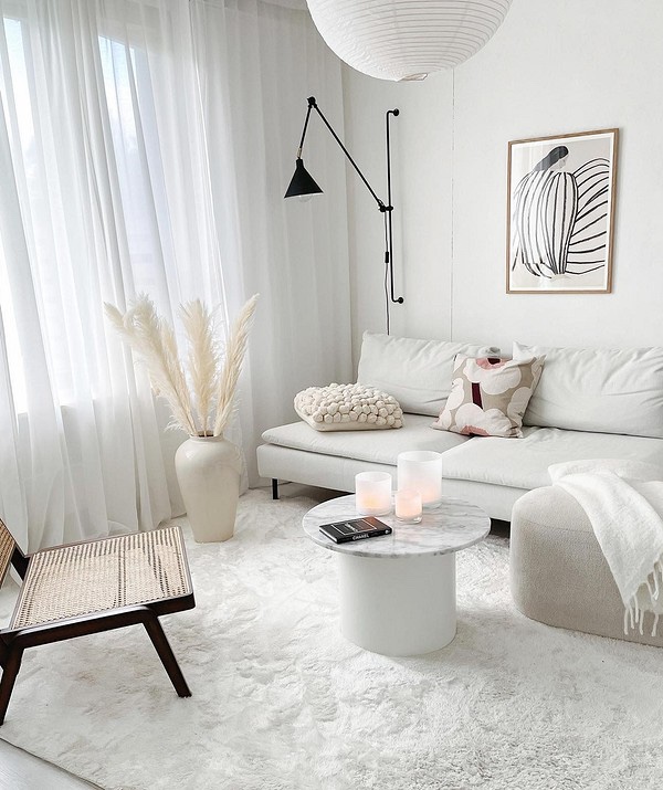 Првиот метод е поедноставен и попознат за повеќето – излегува спектакуларен лесен ентериер, но со визуелни сидра кои ги ставаат потребните акценти. Но, вториот е погоден за оние кои сакаат нестандардни решенија и експерименти. Во овој случај, само белината е присутна во просторот, но може да се користат различни нијанси. За да спречите таков ентериер да изгледа здодевен или болнички стерилен, треба да додадете различни текстури и да размислите за осветлување на повеќе нивоа, како и да ги отворите прозорците што е можно повеќе за да ја пушти сончевата светлина во просторијата. Подобро е сите површини да се мат, затоа што сјајот ќе ја направи веќе прилично кул палетата непријатна.