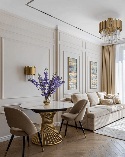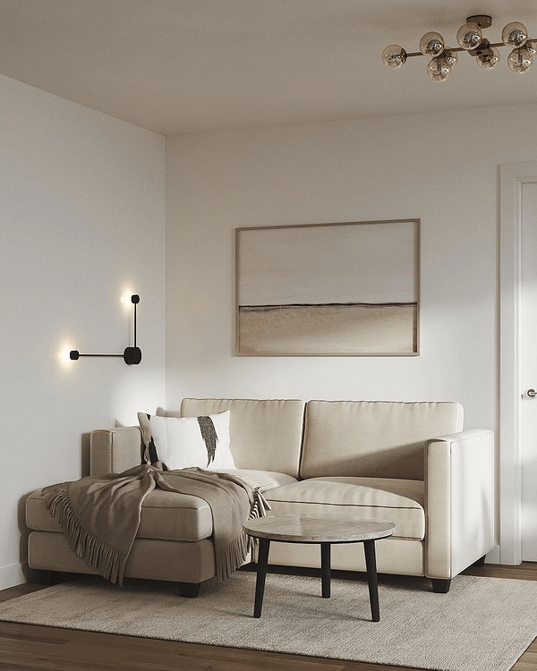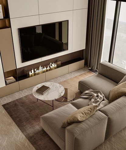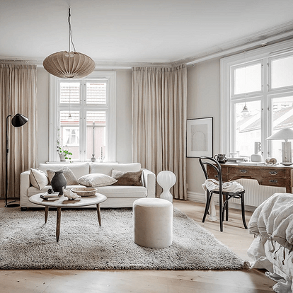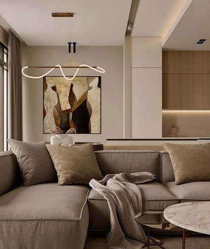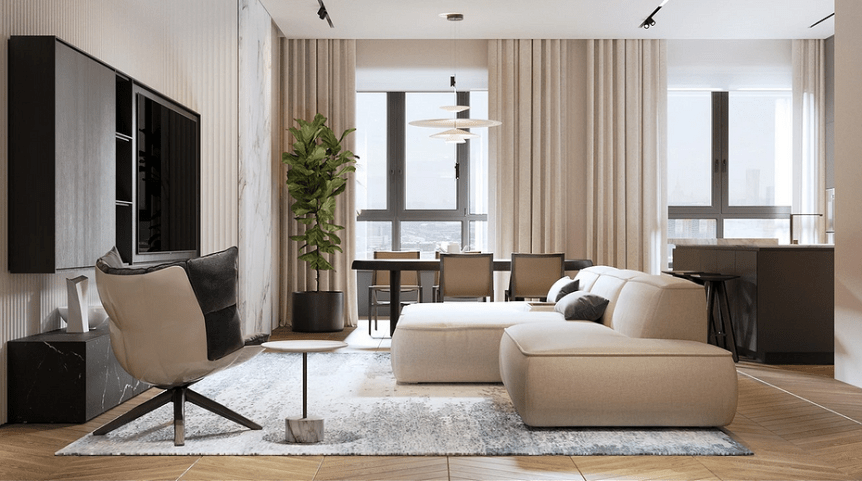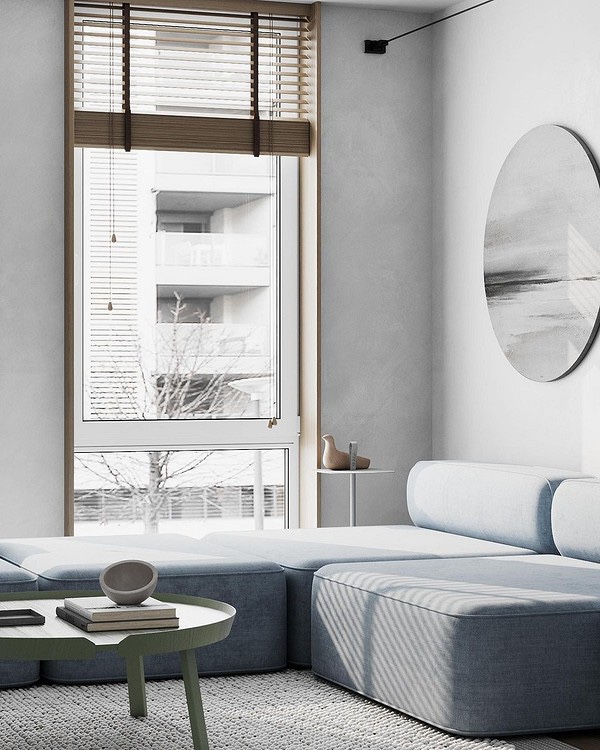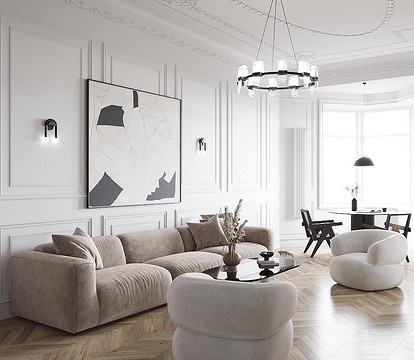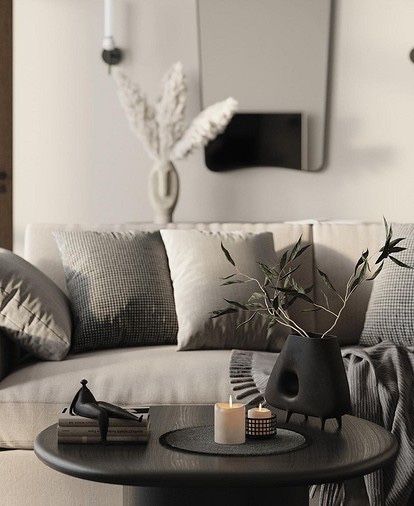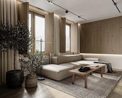 Се создава со помош на обвивни нијанси, често во иста боја (на пример, беж или топло сива) – така што ќе добиете пријатна монохроматска или речиси монохроматска палета. Неутралноста на нијансите се компензира со различни форми и текстури: комбинирајте дрво, мермер, метал, природни ткаенини, живи растенија, итн. кафе, слонова коска итн. Дополнете ги со контрастни акценти: црна, темно сива, длабока сина, смарагд.
