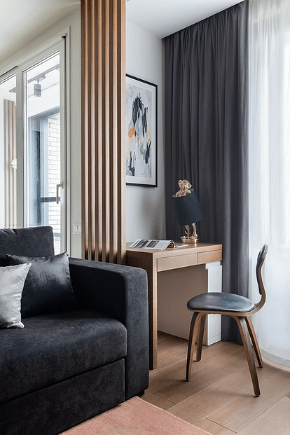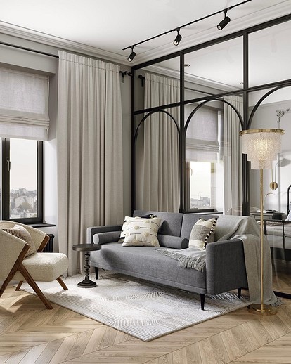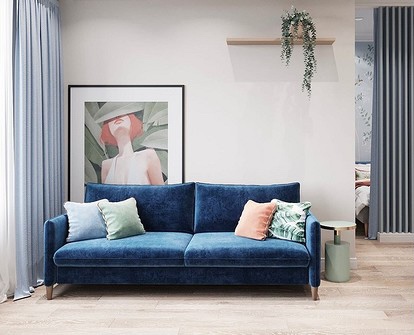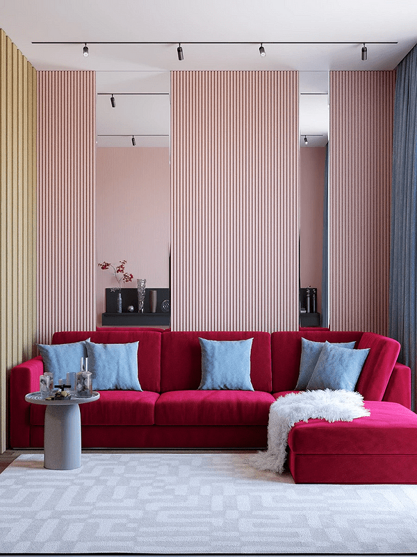 Наспроти позадината на воздржана палета и неутрална завршница – светла точка во боја, чија улога ја игра софата. Може да биде или модуларен дизајн или класичен модел. Главната работа во овој дизајн е општата мирна шема на бои, против која ќе се истакне единствениот голем предмет. Изберете благородни длабоки нијанси: бордо, слива, темно сина, длабоко виолетова, теракота, смарагд, окер, праска, нане, корали итн.
