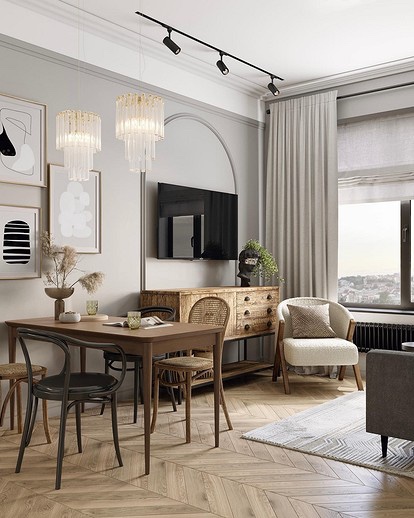Во модерната дневна соба од 2023 година, тоа првенствено се изразува во употребата на мебел од природни материјали. Откажете се од пластика и евтина иверица во корист на природно дрво, ратан, камен. Да, таквите производи се поскапи, но ова е профитабилна инвестиција, бидејќи тие ќе траат многу подолго од буџетските аналози. Покрај тоа, природните текстури изгледаат поблагородни – а во исто време природни. Тие ќе создадат чувство на удобност во просторијата без да ја направат поевтина или да го поедностават дизајнот. Дополнете го таквиот мебел со текстил од природна ткаенина и лаконски декор во истиот концепт.