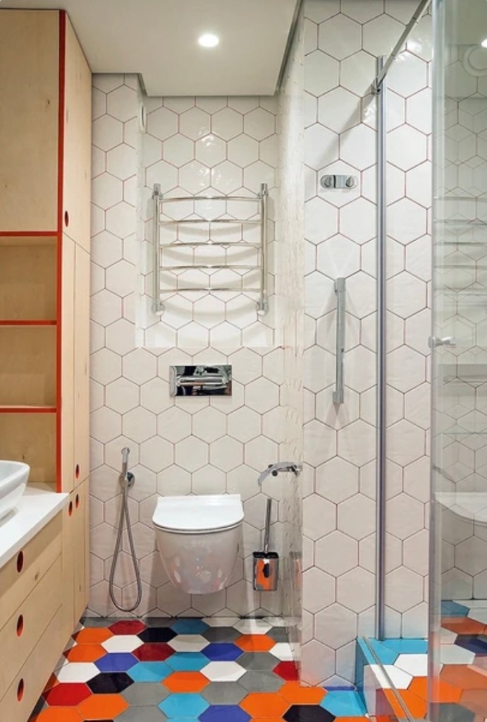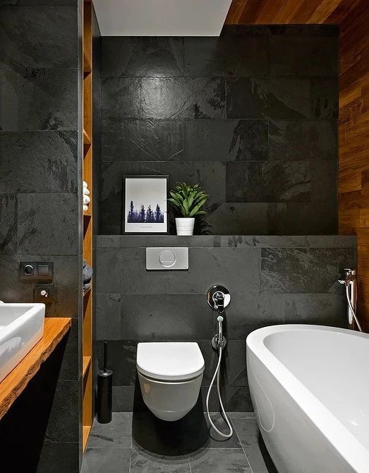 Во оваа бања на мал квадратен метар, беше можно да се постават не само сите потребни водоводи, туку и корисно да се искористи максималниот простор. Зад тоалетот има полица на која можете да поставите и декор и потребни ситници. Има вградена решетка со многу прегради од страна. И покрај толку голема количина на отворено складирање, внатрешноста изгледа хармонично. Ова беше постигнато благодарение на униформниот дизајн: сите бои се во хармонија една со друга и се избрани според целокупниот стил. Внатрешната декорација на полиците одекнува на дрвената облога зад бањата, а поставата од страна е изработена со истите црни плочки како и останатите ѕидови. Локацијата на решетката со излез на полиците од страна е исто така успешна: нивната содржина не е забележлива и не создава визуелен шум.