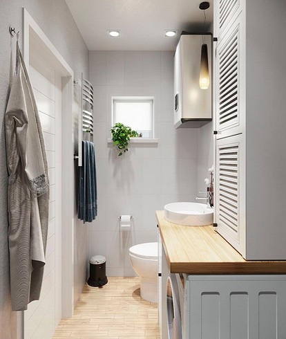 Во оваа бања со површина од 3 квадратни метри, беше можно да се организира систем за складирање од големи размери според стандардите на вкупната површина. Изграден е околу машината за перење. Лесните шкафчиња се покриени со ролетни врати и речиси се спојуваат со финишот. Зад нив има многу полици каде што можете да складирате сè: од креми за лице до прашок за перење и крпи. Централниот елемент овде е работната плоча. Има мијалник и горни шкафчиња, под него има машина за перење и долни фиоки. Во бањата има мал прозорец. Можете да поставите домашно растение или декор на прозорецот, а доколку е потребно, користете го за дополнително складирање: на пример, ставете уредна корпа или организатор со ситници таму.