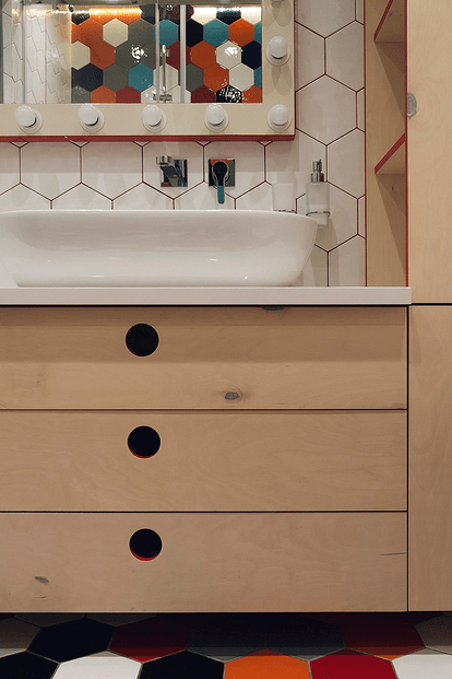 Вообичаено во мали бањи под мијалникот се поставува шкафче со неколку полици, на кое се поставува се што ви треба. Во истата бања, прашањето за складирање беше решено покреативно: цел систем на кабинети од иверица во светла рамка беше организиран под и до него. Тие вклучуваат многу фиоки и полици со различни конфигурации кои ви овозможуваат удобно да складирате различни предмети: крпи, козметика, хемикалии за домаќинство, залихи за домаќинството. Постојат отворени и затворени делови.