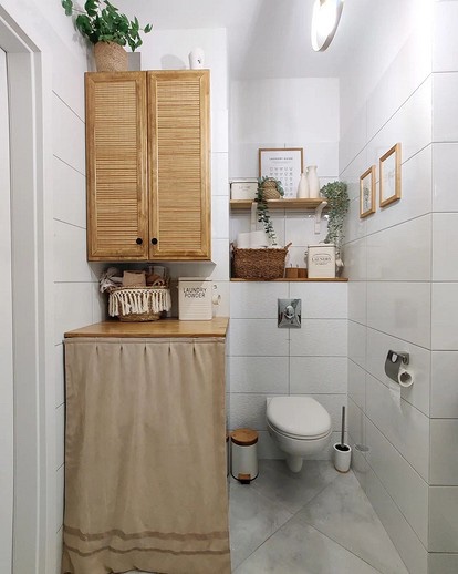 На прв поглед, незгодниот распоред на оваа бања не е воопшто приметлив. Во длабока ниша беше поставен тоалет со инсталација, над кој беше закачена дополнителна полица. Има доволно простор и за корисни ситници и за накит. На влезот имаше затворено складиште: пространа подна фиока покриена со завеса и плиток висечки ормар со ролетни врати. Резултатот е комплет во кој можете да складирате се што ви треба за хигиенски потреби и чистење.