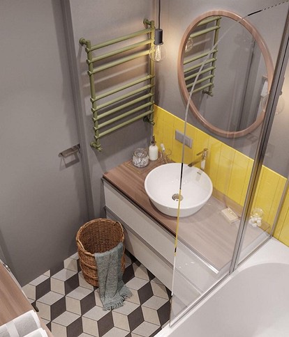 Малите бањи традиционално се украсени во неутрални светли бои. Но, во нестанбена просторија можете да експериментирате и да додадете јаки акцентни бои. На пример, овде фасадата на кабинетот беше обоена во светло жолта боја за да ја поддржи сликата на ѕидот и плочките спроти. Резултатот е богат акцент, кој во исто време ја игра улогата на декор – интересно решение за простори каде што нема простор за дополнителни украси. Дизајнерите не заборавија на функционалноста: на мала површина организираа разновидно складирање, искористувајќи го максимумот од слободниот простор. Има два пространи кабинети – под мијалникот и до машината – и две полици за хигиенски производи.