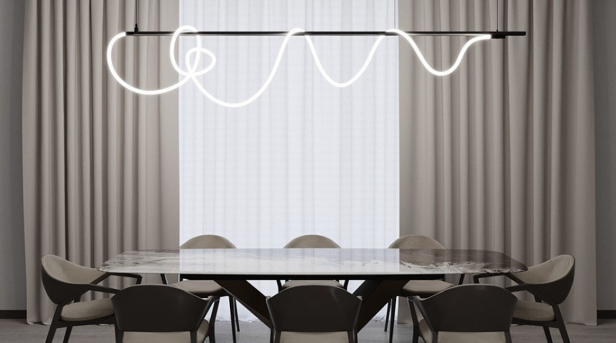 Главниот тренд е дека осветлувањето повеќе нема чисто функционален карактер, туку станува декор елемент, дополнувајќи го внатрешниот дизајн. Нестандардна светилка над трпезариската маса ќе ја направи место за атракција каде што се собира целото семејство. На пример, можете да користите флексибилен неон – ова решение изгледа необично. Со такви дизајни, лесно е да се создаде речиси секој состав – користејќи проѕирни конектори и специјални додатоци за прицврстување. Ваквите инсталации изгледаат особено импресивно на голема површина со високи тавани.Важна нијанса: при изборот на такви системи за осветлување, нивниот квалитет треба да се стави на прво место – така што сјајот е светол и униформен на целата површина.