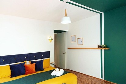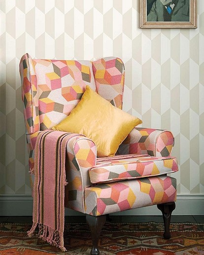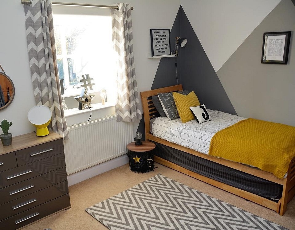 И на оваа слика, шаблонот на ѕидот е поддржан со цик-цак на завесите и тепихот, со што просторот се чувствува поцврсто: