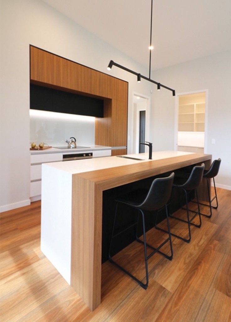 Плочките се поставуваат во најранливата работна површина, ламинирани панели – во сите останати: трпезарија, простор за рекреација. Излегува убаво и практично. Многумина се исплашени од дизајнот на спојот на две површини. Но, не е тешко да се направи: има специјални материјали за продажба за ова. Обично ставаат пластичен или алуминиумски профил. Се произведуваат во различни бои: од бела до темно сива или црна. Има многу темни и светли нијанси.