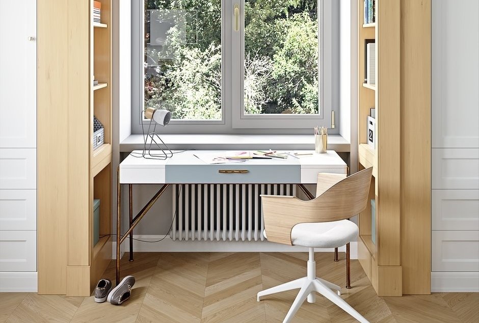 Идеално решение ќе биде локацијата на работната површина долж прозорецот. Сè што треба да направите е да додадете малку вештачко осветлување во форма на пар светилки за да создадете удобни услови во вечерните часови.