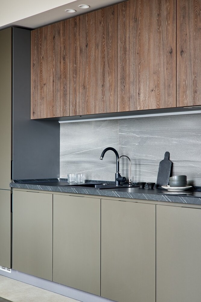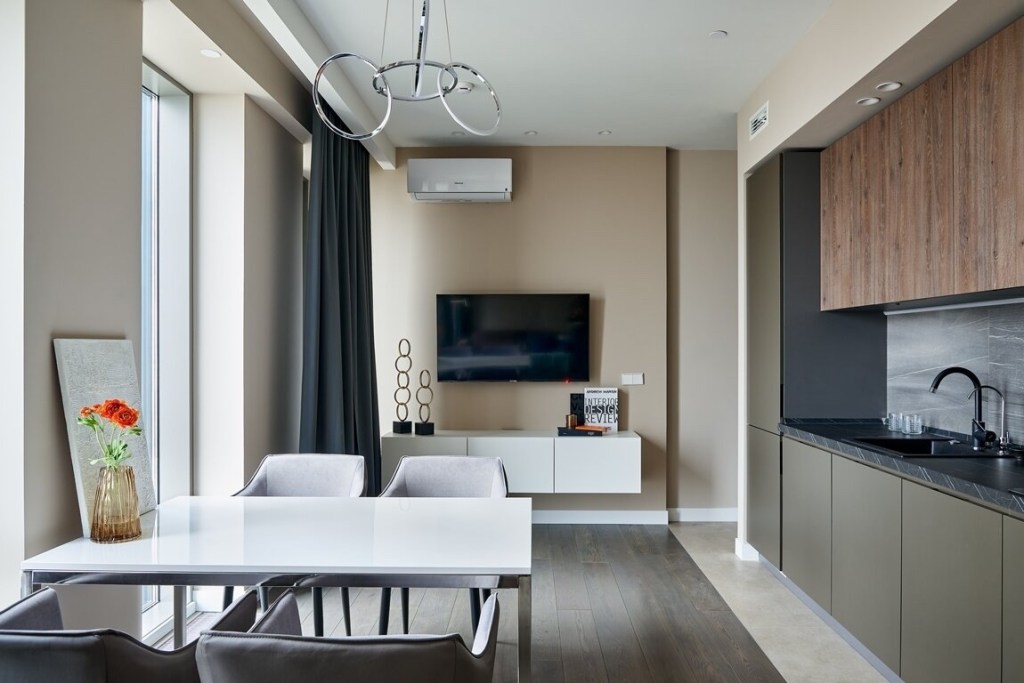 Линеарен кујнски сет беше вграден во ниша спроти прозорецот. Визуелно не зазема многу простор, додека должината на мебелот е 4 метри. Во центарот на студиото беше поставена трпезариска маса.