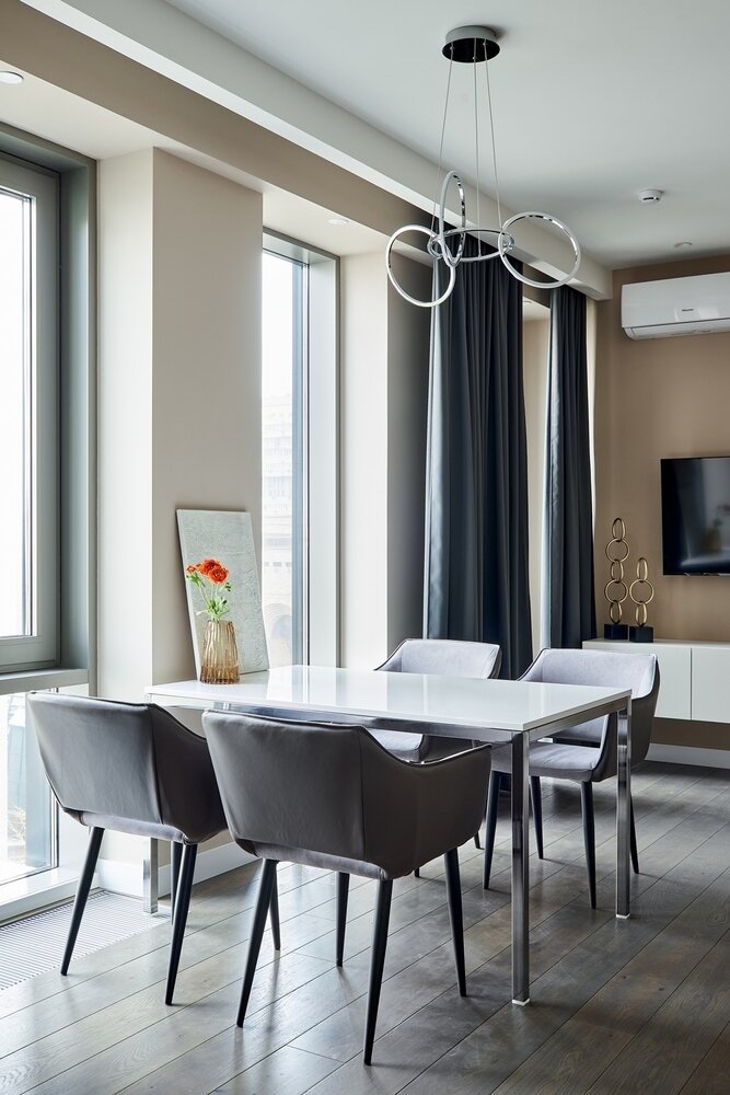 Трансформирачки тросед во нежна беж нијанса е погодна за релаксација по напорен ден. Поради трите големи прозорци во текот на денот, станот има многу светлина, а навечер затемните завеси создаваат атмосфера на удобност.