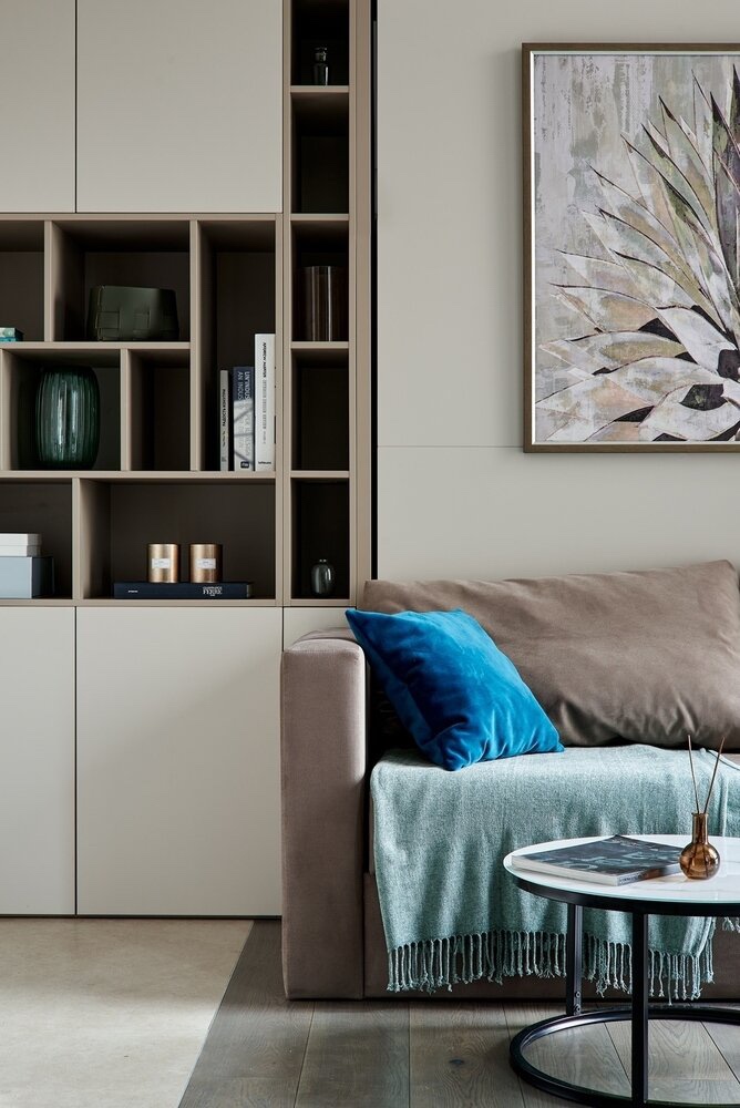 Главната желба за ентериерот беше лесен модерен стил со мали акценти на светли бои. Затоа, зедовме мирни меки нијанси на сива, маслинка, орев како основа и им дадовме предност на природните пријатни текстури.