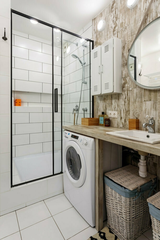 Над машината за перење има прилично пространо шкафче каде што можете да скриете хемикалии за домаќинство и текстил. Во просторот за туширање беше обезбедена мала полица за кутии со средства за хигиена – така што се е при рака и не мора да се истегнувате далеку. За осветлување беа вградени ЛЕД светилки.