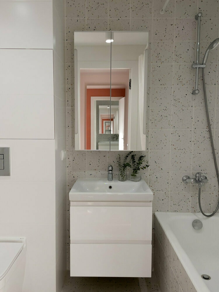 Дизајнерот ја прошири стандардната комбинирана бања, како резултат на тоа, 4,6 м2 беа доволни за просторот да биде функционален, без испакнати агли и празен простор.