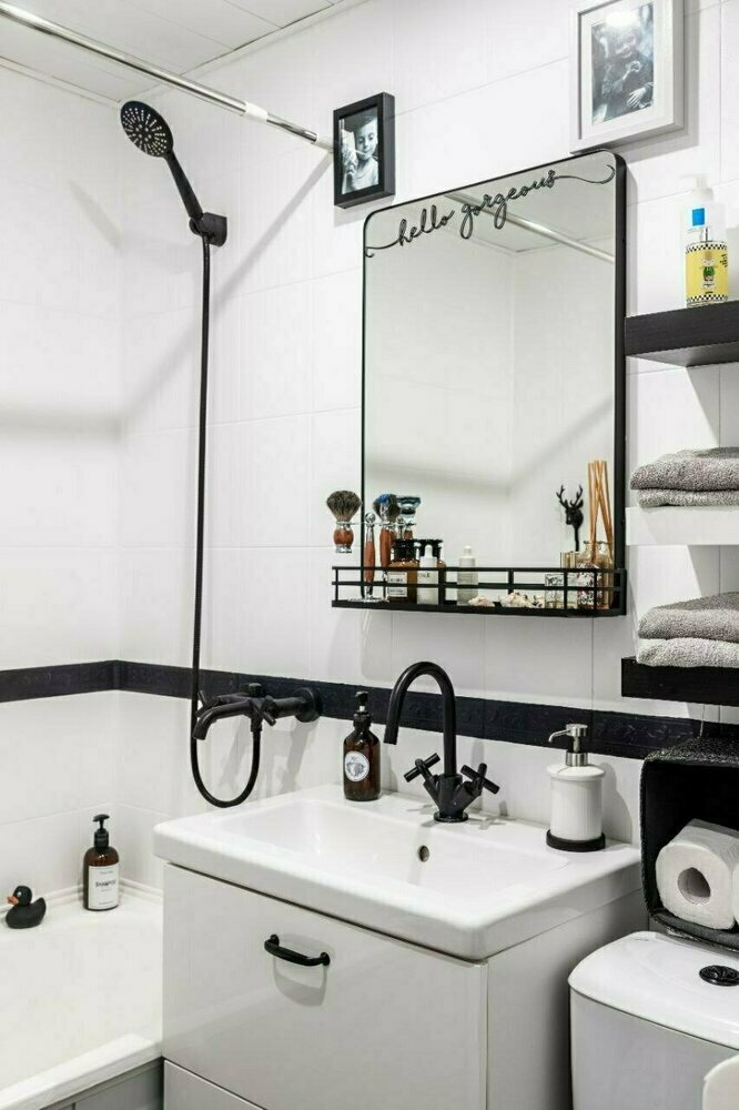 Патем, неколку техники за дизајн помогнаа да се постигне ефектот на стилски простор. Првиот е контрастна комбинација на бели и црни нијанси. Тие и даваат на бањата графичност и наликуваат на скандинавски ентериери. Вториот трик е да го користите декорот во бањата. Да, и тој има место овде! Рамките за фотографии, прекрасните резервоари за складирање и корпите ја прават атмосферата поудобна.