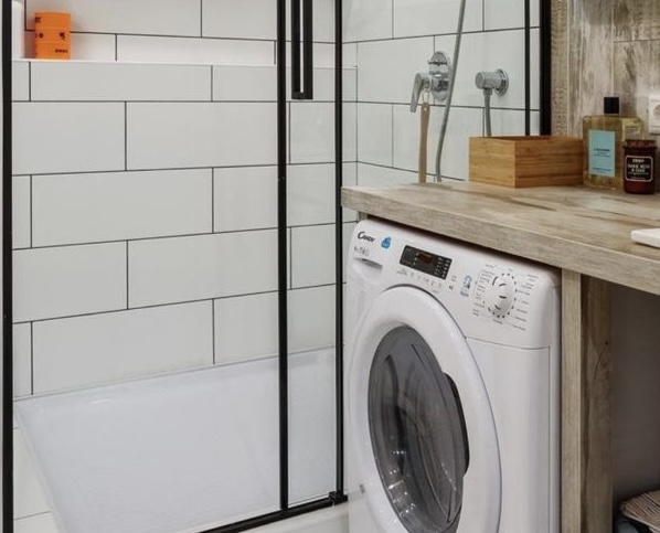 Над машината за перење има прилично пространо шкафче каде што можете да скриете хемикалии за домаќинство и текстил. Во просторот за туширање беше обезбедена мала полица за кутии со средства за хигиена – така што се е при рака и не мора да се истегнувате далеку. За осветлување беа вградени ЛЕД светилки.