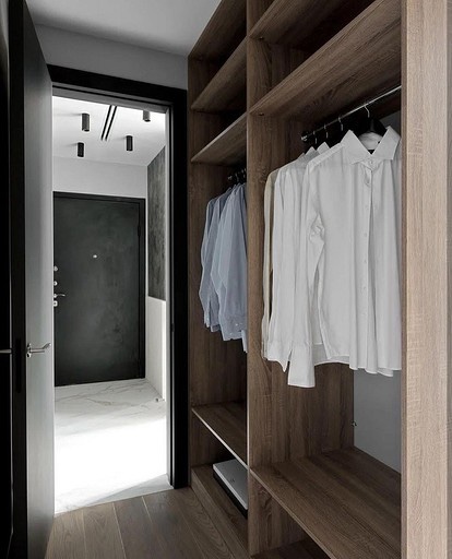 Сите полици и закачалки се поставени по еден ѕид. Ова е опција за многу компактни соблекувални или прилично тесни. На овој начин можете да ги раширите работите и да оставите простор за движење.