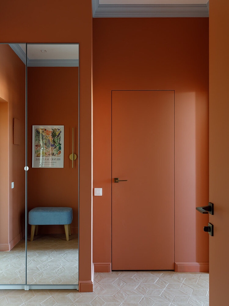 За да ја изненадите внатрешноста уште од самиот праг, обојте го ходникот во светла теракота сенка. Топлата палета на бои развеселува и оживува. Плочките со фин формат во комбинација со теракота даваат чувство на врел песок во медитеранско одморалиште.