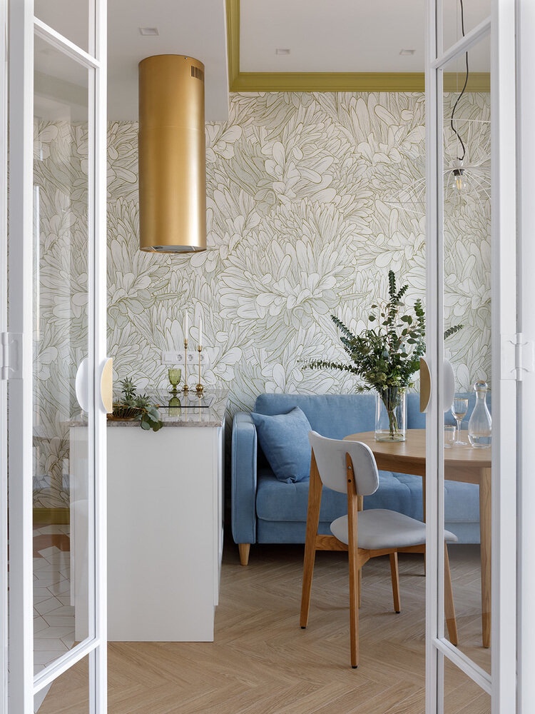 Кога станува збор за купување на тапети, најчесто изборот паѓа на мал „сигурен“ принт. Но, ефектот wow е тој што создава големи цртежи. Во декорацијата на ѕидот, користено е дизајнерска позадина наречена „Песна на летото“. Совршено се вклопуваат во внатрешниот концепт. Големиот цветен дезен изгледа одлично во релативно компактен простор, што го прави повоздушен и динамичен.