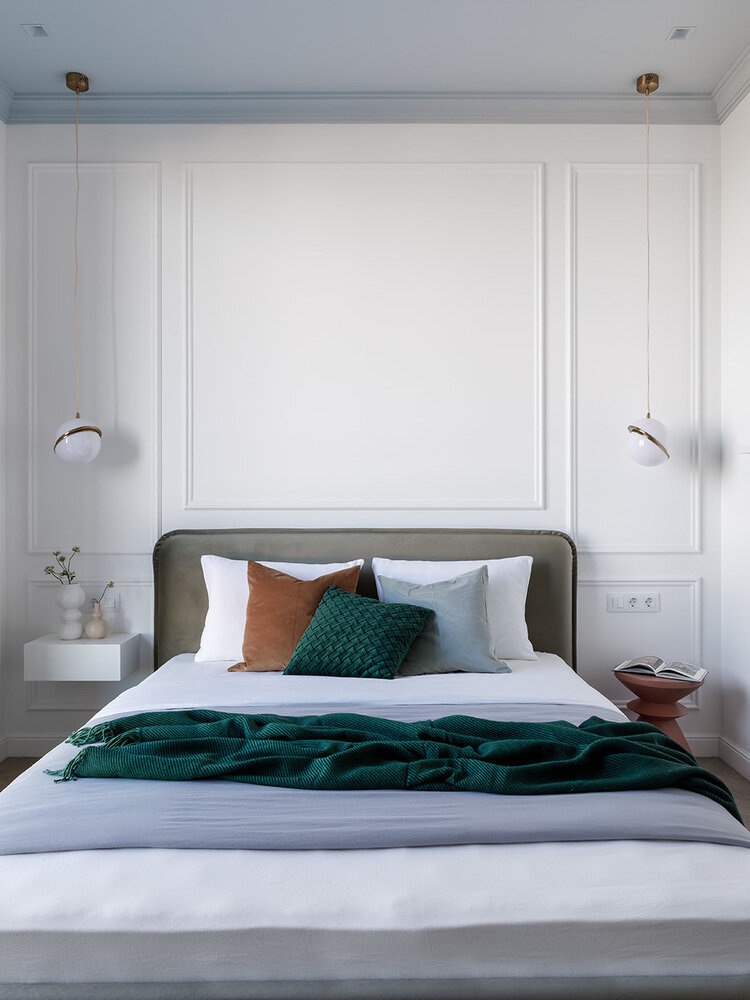 Спалната соба го пресоздаде летното небо на таванот, сликајќи го во многу пријатна сиво-сина нијанса. Истата боја е обоена на тавански светилки за да не се истакнуваат на обоениот таван.