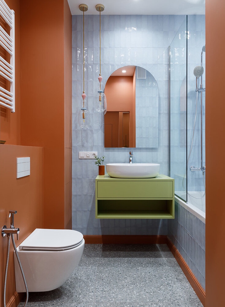 Контрастот на завршните материјали создава интересен ефект. Сините сјајни плочки наликуваат на вода и се ладни, додека ѕидовите од теракота се топли. Бањата ги комбинира сите бои и акценти на станот. Во исто време, сè изгледа хармонично и избалансирано.