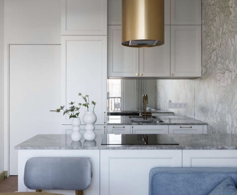Во кујната има доста кабинети за складирање и тие не изгледаат гломазни. Леснотијата се додава со престилка за огледало што ја рефлектира светлината од прозорецот.