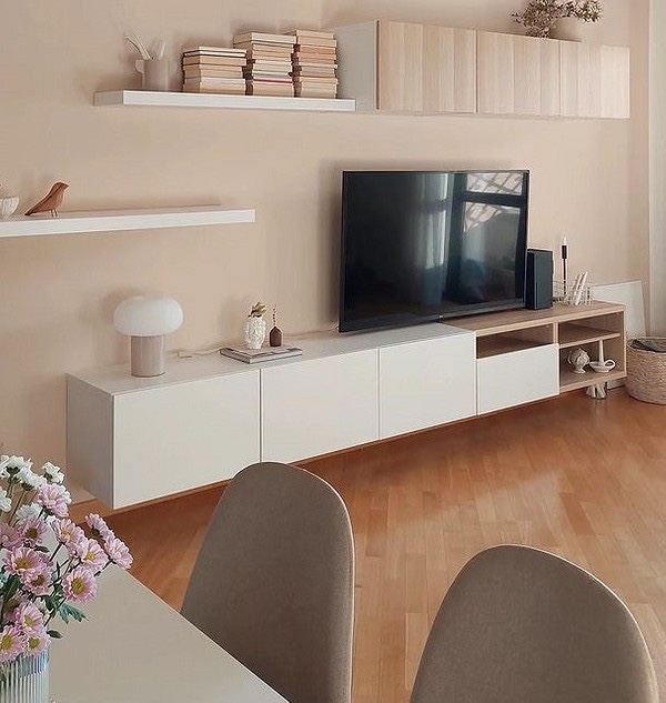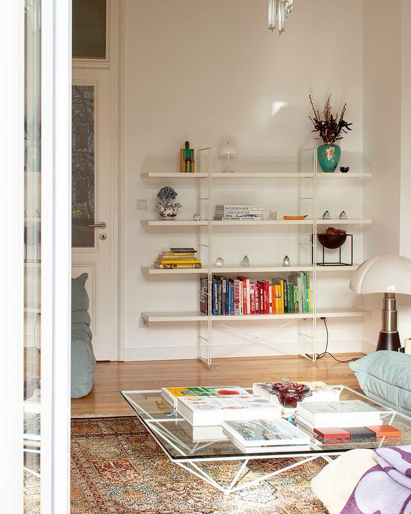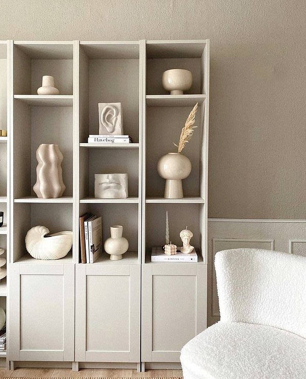 За содржината на отворените полици да не ја преоптоварува внатрешноста и да не создава визуелен шум во просторијата, обидете се да го усогласите декор со целокупниот дизајн на просторот. Земете една од основните бои на палетата како главна и изградете ја содржината околу неа. Ова е особено точно за минималистичките ентериери, каде секој дополнителен детал или сенка може сериозно да влијае на целокупната перцепција на просторот. На пример, ако собата е украсена со беж тонови, книгите може да се наредат на полиците, свртувајќи ги со кориците навнатре, така што само светлите листови остануваат видливи.