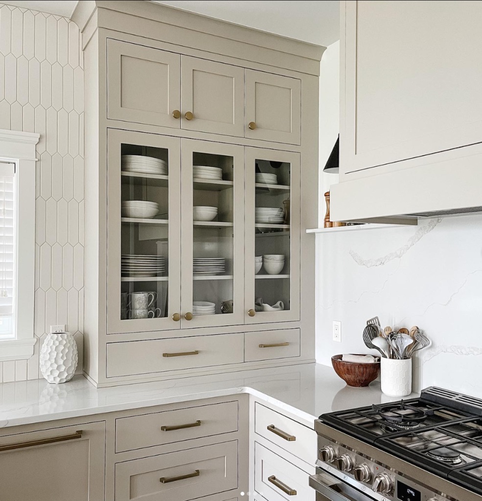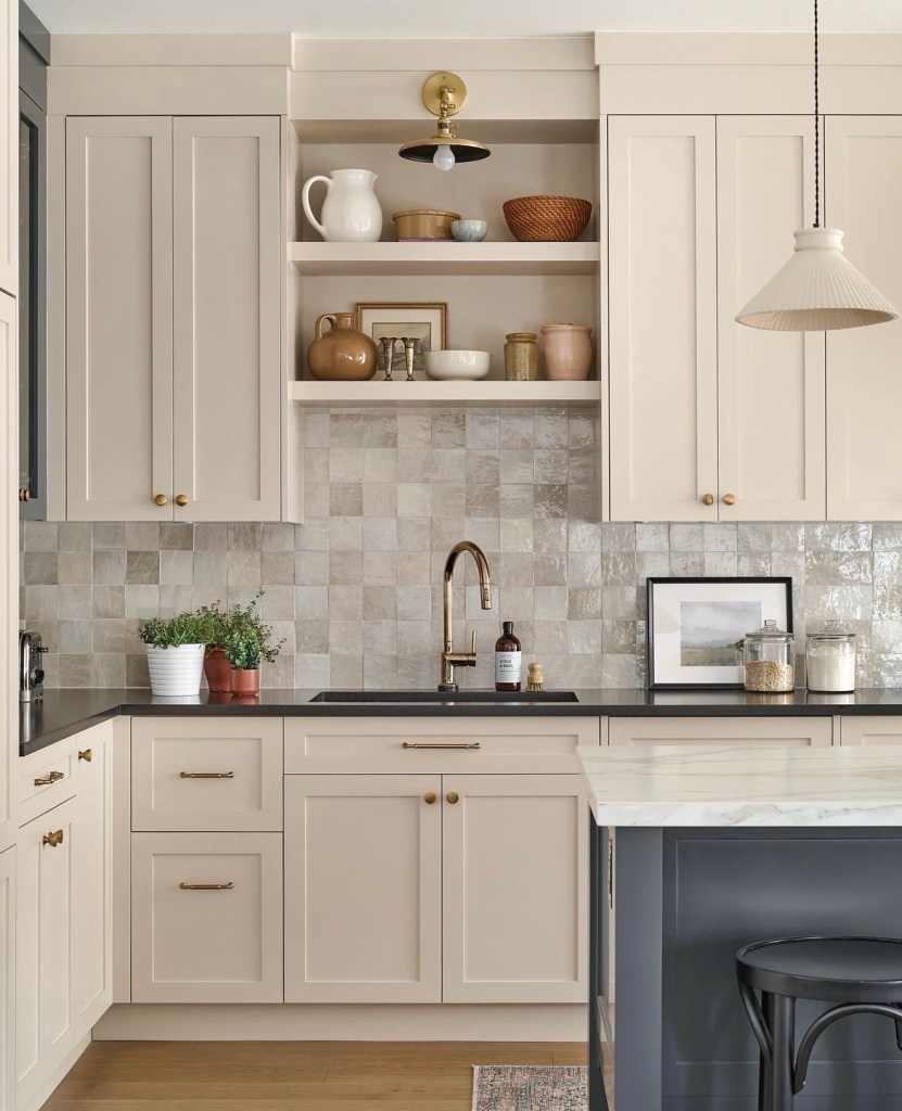 Темната и беж бојата на кујнските кабинети ќе бидат во тренд за 2024 година. Одлучете се за врата во стил на шејкер, со минимални и чисти линии. Измешајте златни акценти за да направите контраст.