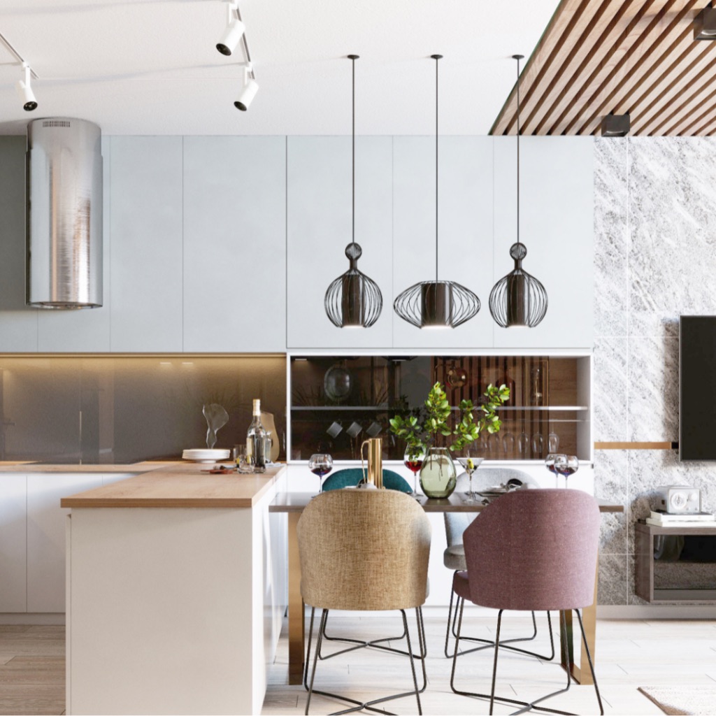 Сè повеќе луѓе ги ценат патувањата и искуствата над својот дом. Така, луѓето се одлучуваат за помали домови со поголема функција. Оваа кујна е двојна како трпезарија со маса прикачена на островот.
