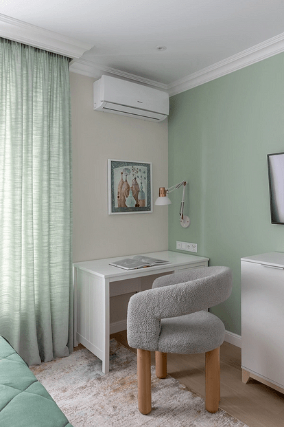 - Минт: Освежувачка нијанса на зелената, смешан со сини и сиви, изгледа необично, но не премногу јако. Овој боја посебно често може да се сретне во оформувањето на кујни, спални, детски соби, санитарни простории.