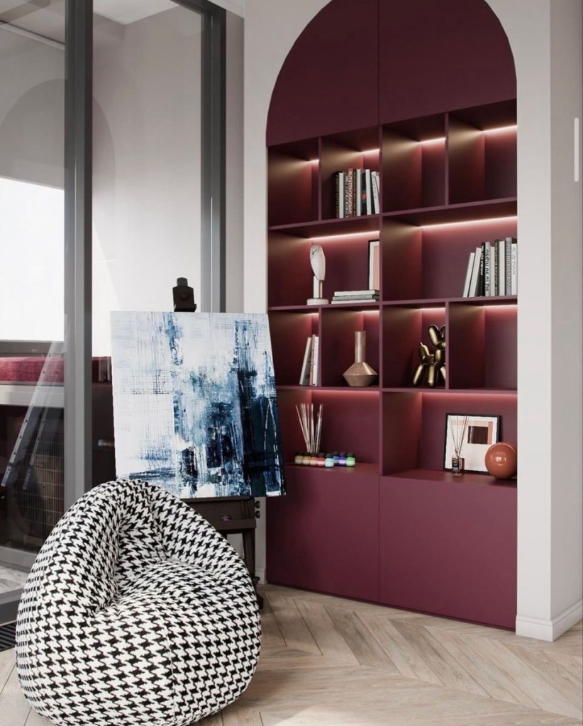- Вино: Најмодната боја во 2025 година според големиот бренд на боите за ентериер Behr. Во него се комбинира јачината на црвеното и пригушените природни тонови на кафеавото. Иако сложената нијанса, ја препорачуваат да се користи не само како локален акцент, туку и како основна. Виното хармонично изгледа со бежово, зелено, кафеаво, бело и црно.