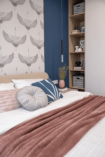 - Бледо-сина: Нежна сина нијанса која потсетува веднаш на две елементи: воздух и вода. Визуелно го шири просторот, го прави полесен и поладен. Прекрасно функционира како позадина, може да се употребува за обработка на ѕидови и поголемиот мебел. За да не изгледа премногу ладно, дополнувајте го со природни бои и природно дрво.