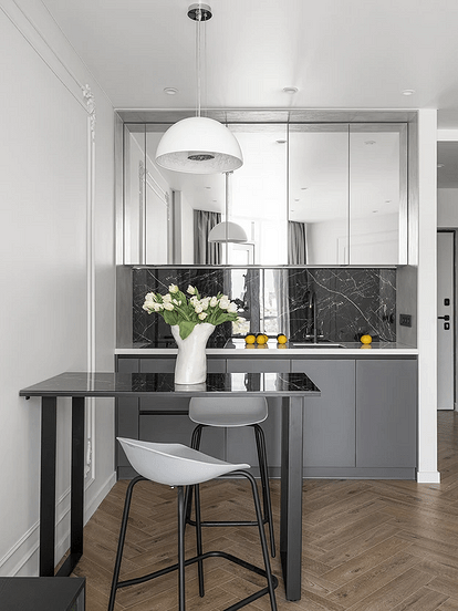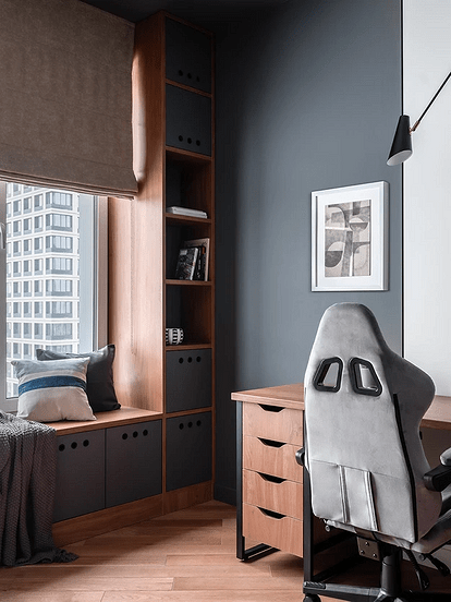 - Јаглен-сиво: Јаглен темно-сив нијанса – универзален, но посмел од повеќето други варијации на ахроматот. Може да изгледа премногу мрачно за основна обработка, па затоа често се користи како контрастен елемент: на пример, во индивидуалниот мебел или поголемиот декор, на еден акцентен ѕид. Добро изгледа на позадината на дрво, исто така, хармонира со ладни текстури: мермер, стакло, метал.